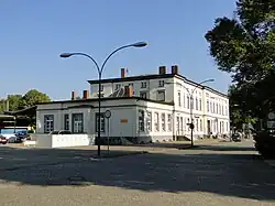 Durch den Bau und die Inbetriebnahme weiterer Bahnstrecken wurde auch eine Erweiterung des Empfangsgebäudes erforderlich. So wurde die von der Straßenseite gesehen rechte Seite des Gebäudes angebaut.[3] Da im gleichen Stil gehalten, sieht man dem Bauwerk die Erweiterung erst bei genauerem Hinsehen an. Der neu entstandene Eckrisalit ist breiter als der linke Eckrisalit und der jetzige Mittelrisalit. Auch ist der Anbau mit nur drei Querachsen schmaler als der Rest des Gebäudes. Die Überdachung des Hausbahnsteigs besitzt Wandanschluss. Innerhalb des Gebäudes wurden einzelnen Abteilungen mit dem Umbau neue Räume zugewiesen, so kam die Post ins bisherige Telegrafenzimmer, aus dem Wartesaal der 1. und 2. Klasse, der sich fortan in der neuen Haushälfte befand, wurden die Telegrafieräume und die Gepäckabfertigung. Im zweiten Geschoss existierten Wohnungen, ein Büro sowie das Zimmer des Boten.[3] Die Fenster im Mezzanin-Geschoss wurden nachträglich vergrößert.[4]