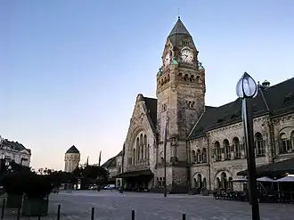 Von 1905 bis 1908 wurde die heute noch bestehende Anlage gebaut. Sie hat ein repräsentatives, vom Berliner Architekten Jürgen Kröger im neoromanischen – typisch wilhelminischen – Stil entworfenes Empfangsgebäude mit 300 Meter langen Bahnsteigüberdachungen.[3] Mit Inbetriebnahme dieses neuen Durchgangsbahnhofs 1908 wurde im Raum Metz auch das Eisenbahnnetz umstrukturiert. Es entstanden mehrere neue Strecken, darunter mit einem neuen Anschluss in Richtung Luxemburg und der vollständig neu erbauten Linie nach Anzeling zwei, die den neuen Metzer Bahnhof von Norden erreichten.