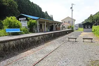 Die Mikawa-Linie führte nördlich von Sanage durch eine dünn besiedelte ländliche Region und war deshalb stark defizitär. Als Sparmaßnahme begann die Meitetsu am 14. März 1985 auf diesem Teilstück Einzel-Dieseltriebwagen im Einmannbetrieb einzusetzen und entfernte anschließend die Oberleitung. Darüber hinaus war der Bahnhof nicht mehr mit Personal besetzt.[5] Die anhaltende Landflucht hatte zur Folge, dass der Bahnbetrieb nördlich von Sanage weiterhin verlustbringend war und in hohem Maße quersubventioniert werden mussten. Nachdem die Meitetsu-Geschäftsführung im März 2000 die bevorstehende Stilllegung des Abschnitts angekündigt hatte, erfolgte diese schließlich am 1. April 2004.[6] Einige Jahre später ließ die Stadtverwaltung von Toyota den ehemaligen Wartesaal renovieren; seit November 2015 betreibt ein lokaler Verein darin ein Café.[7]