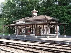 Auf der gegenüberliegenden Seite der Gleisanlage steht der Gästebahnhof der Brauerei Feldschlösschen. Das Gebäude stand ursprünglich ab 1900 in Basel an der Heuwaage und diente als Endstation der Birsigtalbahn. Es wurde 1986 dort abgebrochen und 1989 in Rheinfelden wieder aufgerichtet. Von dort aus verkehren sporadisch Nostalgiezüge ins rund 800 Meter entfernte Brauereiareal. Der eingeschossige Gästebahnhof besitzt ein vom Jugendstil beeinflusstes Fachwerk sowie ein Walmdach mit Uhrtürmchen. Das dreiseitig umlaufende Vordach wird von profilierten Holzsäulen auf steinernen Postamenten gestützt.[2]