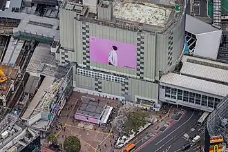 Die Gegend rund um den Bahnhof, insbesondere an der Westseite, ist eines der bekanntesten Einkaufsviertel Tokios. Auf dem nordwestlichen Vorplatz steht eine Statue des Hundes Hachikō. Sie ist eine der bekanntesten Kunstwerke Japans im öffentlichen Raum und ein beliebter Treffpunkt.[4] Neben dem Vorplatz befindet sich eine sehr belebte Straßenkreuzung, die für ihre Diagonalquerung bekannt ist: die Shibuya-Kreuzung kann nicht nur rechtwinklig, sondern auch diagonal gequert werden. Sie gilt als Wahrzeichen und Symbol für die Geschäftigkeit und Enge der Stadt. Häufig wird sie als „belebteste Fußgängerkreuzung der Welt“ bezeichnet.[5] Rund um diese Kreuzung stehen verschiedene Kaufhäuser und Ladenpassagen wie Shibuya 109, Center Gai, Tōkyū Department Store, Tōkyū Hands, Loft Shibuya, Seibu Shibuya Department Store, Marui, MODI und MEGA Don Quijote.[6] In der Nähe zu finden sind auch das NHK-Sendezentrum und die NHK Hall. Gegenüber dem südwestlichen Bahnhofsvorplatz steht das Einkaufszentrum Shibuya Mark City. Auf der Ostseite des Bahnhofs stehen die Wolkenkratzer Shibuya Hikarie (180 m), Shibuya Scramble Square (229 m) und Shibuya Cross Tower (131 m).