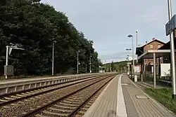 Das aus Backsteinen errichtete zweigeschossige Empfangsgebäude besteht aus einem giebelständigen Gebäudeteil, an den in westlicher Richtung ein traufständiger Bau anschließt. Zum Hausbahnsteig vorgelagert besteht ein einstöckiger Anbau mit Flachdach und Unterstand, östlich schließt ein ebenfalls einstöckiger Anbau mit Walmdach und gerade Schleppgaube an. Westlich des Empfangsgebäudes steht ein eingeschossiger, traufständiger Fachwerkbau mit Giebeldach, der dem Güterverkehr diente.