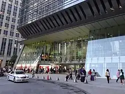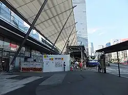 An der Ostseite der Anlage steht ein dreiteiliger Gebäudekomplex. Er besteht aus zwei baugleichen Wolkenkratzern namens GranTokyo und dem dazwischen liegenden Mittelteil namens GranRoof, das als zweites Empfangsgebäude dient. Gemäß den verantwortlichen Architekten Helmut Jahn und Werner Sobek sollen die Wolkenkratzer „in Licht umhüllte Kristalltürme“ symbolisieren, während der Mittelteil ein „Segel aus Licht“ darstellen soll.[18] Beide Wolkenkratzer sind 205 m hoch; der nördliche zählt 43 Stockwerke, der südliche 42. Jeweils das zweite Stockwerk der beiden Türme ist mit dem zweiten Stockwerk des viergeschossigen Mittelteils verbunden. Dessen prägendes Element ist das 234 Meter lange Vordach, das als großes flaches Textilpaneel konzipiert ist, das in einer geraden Linie entlang der Fahrbahnkante befestigt ist und auf Stahlrahmen mit unterschiedlichen Höhen und Winkeln im Abstand von 18 Metern aufliegt. Das Paneel ist von der Stahlkonstruktion versetzt, sodass die Oberfläche des Vordachs eine durchgehende leuchtende Fläche bildet.[19] Ein dritter Haupteingang im Nordosten ist seit 2007 in den Sapia Tower integriert und ermöglicht die Erschließung vom benachbarten Stadtteil Nihonbashi her.[20]