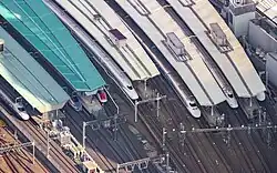 Der von Norden nach Süden ausgerichtete Bahnhof zählt in seinem oberirdischen Teil 20 Gleise an zehn Mittelbahnsteigen. Am westlichsten liegen die Gleise 1 bis 10 des konventionellen Streckennetzes von JR East, das in Kapspur (1067 mm) ausgeführt ist. Hier verkehren Züge der Tōkaidō-Hauptlinie, der Tōhoku-Hauptlinie (bzw. der Utsunomiya-Linie), der Keihin-Tōhoku-Linie und der Yamanote-Linie. Die Gleise 1 und 2 sind auf einem Viadukt über den Gleisen 3 und 4 verlegt, ungefähr auf der Höhe des dritten Stockwerks des Empfangsgebäudes; sie dienen ausschließlich den Zügen der Chūō-Hauptlinie und der Chūō-Schnellbahnlinie. In der Mitte liegen die Gleise 14 bis 19 von JR Central. Sie sind normalspurig (1435 mm) und dienen den Hochgeschwindigkeitszügen auf der Tōkaidō-Shinkansen. Ganz im Osten liegen die normalspurigen Gleise 20 bis 23 von JR East, auf denen die Hochgeschwindigkeitszüge der Tōhoku-Shinkansen abgefertigt werden. Drei breite Passagen unter den Gleisen hindurch stellen Verbindungen zwischen der West- und Ostseite her, wobei nur beim nördlichsten keine Bahnsteigsperren passiert werden müssen.