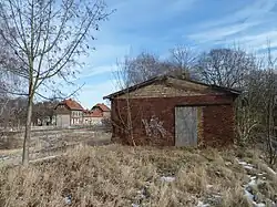 Ein Güterschuppen, rechts vom Empfangsgebäude, ist ein Ziegelbau, der zwischen 1921 und 1930 erbaut wurde.[9] Die Pflasterstraße wurde um 1894 angelegt.[9]