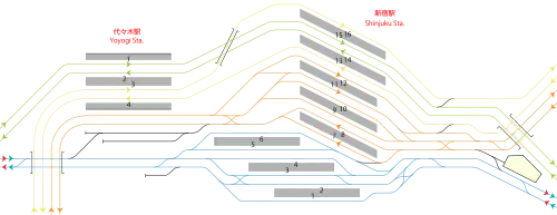 Die von Norden nach Süden ausgerichtete Anlage umfasst neun Gleise am Ende einer sich von Norden her verengenden Gleisharfe. Diese gehört zum benachbarten Bahnhof Shinjuku, dem bedeutendsten Bahnhof Japans, der durch wiederholte Ausbauten sukzessive in Richtung Yoyogi erweitert wurde. So liegen seit 2016 das südliche Ende der Bahnsteige 5 und 6 von Shinjuku und das nördliche Ende der Bahnsteige von Yoyogi nur etwas mehr als hundert Meter auseinander. Die Anfahrt von Shinjuku her gilt unter den Triebfahrzeugführern als der anspruchsvollste Abschnitt der Yamanote-Linie. Gründe dafür sind die unübersichtliche Kurvenlage und das Gefälle bzw. der Anstieg, was es herausfordernd macht, die Bremsen an der richtigen Stelle zu betätigen.[3] Die nach Shinjuku führenden Bahnlinien werden unmittelbar südlich von Yoyogi durch ein massives Überwerfungsbauwerk vorsortiert. Die beiden am östlichsten gelegenen Gleispaare besitzen keine Bahnsteige in Yoyogi. Auf ihnen fahren die Züge der Shōnan-Shinjuku-Linie und der Saikyō-Linie bzw. der Chūō-Hauptlinie und der Chūō-Schnellbahnlinie ohne Halt durch.