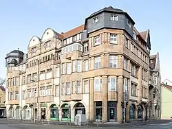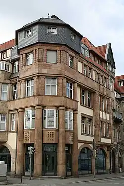 Das viergeschossige, mit einem ausgebauten Dachgeschoss ausgestattete, repräsentative Mietshaus ist in der Fassadengestaltung durch zahlreiche geometrische Jugendstilornamente und den Wechsel von verputzten und Hausteinflächen gekennzeichnet. Alle Flächen scheinen in Bewegung zu sein.
