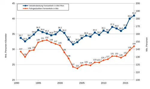 Während die Entwicklung von Fahrgastzahlen und Verkehrsleistung im Personenfernverkehr in den 1990er Jahren zunächst positiv verlief, waren die frühen 2000er Jahre von einem deutlichen Einbruch geprägt, so dass Verkehrsleistung und Fahrgastzahlen unter das Niveau vor der Bahnreform fielen. Als entscheidende Gründe dafür können der Wegfall des Interregio-Netzes sowie unternehmerische Fehler seitens der DB im Zusammenhang mit der Einführung eines neuen Preissystems (2002) genannt werden. Seit 2004 steigen sowohl Fahrgastzahlen als auch Verkehrsleistung im Personenfernverkehr stetig an und erreichten 2017 mit 41 Milliarden Personenkilometern einen neuen Rekord.