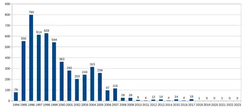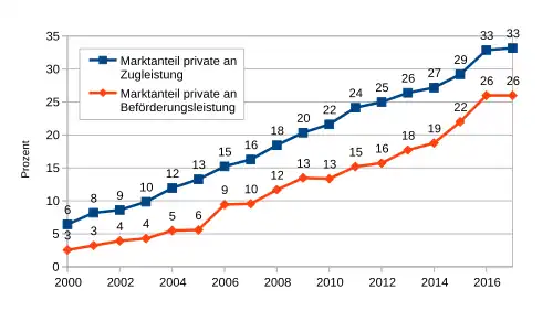 Der Anteil privater Bahnen an den Zugleistungen im Personennahverkehr erhöhte sich von 3 % auf 33 % (2017). Die Fahrgastzahlen insgesamt stiegen von 1,36 Milliarden (1993) über 2,21 Milliarden (2008) auf 2,75 Milliarden (2017) und verdoppelten sich somit seit 1993.[19][20][21] Bei den 2013 durchgeführten Vergaben im Umfang von 53 Millionen Zugkilometern errangen die Unternehmen im DB-Konzern 72 %. Im Jahr 2012 wurden 51 Millionen Zugkilometer per Ausschreibung vergeben, wobei die DB 45 % gewinnen konnte. Die größten Konkurrenten der DB im SPNV sind Transdev, Netinera, Benex, Abellio und Keolis.[20]