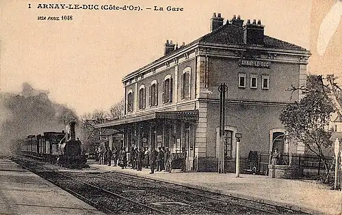 ![]() Ehemaliges Bahnhofsgebäude Arnay-le-Duc, Blickrichtung Süd, 1919 | |||||||||||||||||||||||||||||||||||||||||||||||||||||||||||||||||||||||||||||||||||||||||||||||||||||||||||||||||||||||||||||||||||||||||||||||||