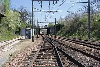 ![]() Östliches Streckenende. Blick zum Bahnhof Bourron-Marlotte-Grez, April 2013 | |||||||||||||||||||||||||||||||||||||||||||||||||||||||||||||||||||||||||||||||||||||||||||||||||||||||||