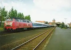 Schnellzug im Bahnhof Cuxhaven (1993), bereits mit einzelnen Interregio-Wagen im Zugverband