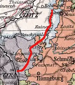 - ↑ Dietmar Franz: Die Geschichte der Gera-Meuselwitz-Wuitzer Eisenbahn. Abgerufen am 11. September 2016., S. 13f.