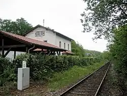 Der Bahnhof Dammheim befand sich südlich des Siedlungsgebietes von Dammheim. Der Bahnhof wurde erst um 1900 errichtet. Der Bahnsteig entstand dabei unweit eines zuvor schon existierenden Bahnwärterhauses.[15] Während der Zeit der Bayerischen Staatseisenbahnen war er als Stationstyp 1 geführt, was bedeutete, dass er „Personen- event. auch Gepäck-Verkehr“ aufwies.[75] 1970 – Dammheim war nur noch ein Haltepunkt – wurde das Personal abgezogen.[76] Das Bahnhofsgebäude wird heute als Wohnhaus genutzt.[77]