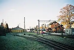 Abzweig geradeaus und ehemals von linksBetriebs-/Güterbahnhof Streckenende und quer (Strecke außer Betrieb)