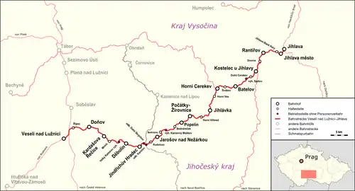 Die Bahnstrecke Veselí nad Lužnicí–Jihlava ist eine eingleisige Hauptbahn („celostátní dráha“) in Tschechien, die ursprünglich vom österreichischen Staat als Teil der Böhmisch-Mährischen Transversalbahn erbaut und betrieben wurde.[2] Sie verläuft von Veselí nad Lužnicí über Jindřichův Hradec (Neuhaus) und Horní Cerekev nach Jihlava (Iglau). Die Strecke wurde am 3. November 1887 eröffnet.[3]