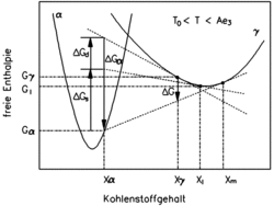 Um die Gleichgewichtskonzentration von Xγα in α bzw. Xαγ in γ zu erreichen, ist eine starke Kohlenstoffdiffusion notwendig. Dabei sinkt die freie Enthalpie der γ-Phase etwas von Gγ auf Gαγ, während die freie Enthalpie eines in α umgewandelten Volumenelements stark auf Gγα erniedrigt wird. Das Gesamtsystem senkt dabei seine freie Enthalpie um den Betrag ΔG ab. Die Triebkraft für die Umwandlung ist durch ΔGα gegeben.