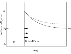 Die Aufteilung von ΔGα in ΔGd und ΔGs ergibt sich aus der Bedingung, dass die Diffusion mit der gleichen Geschwindigkeit wie die Scherung ablaufen muss. Durch diese Koppelung von Diffusion und Scherung bilden sich die Kohlenstoffkonzentrationen dynamisch vor der sich bewegenden Grenzfläche aus, wie Bild 14 zeigt. Die höchste Kohlenstoffkonzentration des Austenits Xi stellt sich in der Grenzfläche ein. Der Kohlenstoff diffundiert von dort in den Austenit ab, wodurch der Kohlenstoffgehalt des Austenits Xγ steigt (gestrichelte Kurve in Bild 14). Nähert sich Xγ an den Wert Xm, so wird eine weitere Reaktion unmöglich, da keine Enthalpieabsenkung des Gesamtsystems ΔG mehr auftritt. Die bainitische Umwandlung hört auf und kann nur durch Absenken von Xγ z. B. durch Carbidbildung oder durch Absenken der Temperatur fortgesetzt werden.