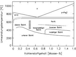 Ein weiterer umstrittener Aspekt der Bainitbildung ist die Übergangstemperatur vom unteren zum oberen Bainit. Man geht davon aus, dass diese – wie in Bild 10 gezeigt – mit steigenden Kohlenstoffgehalten von 400 °C auf etwa 550 °C bei 0,5 Masse-% C ansteigt. Bei weiter steigenden Kohlenstoffgehalten stellt sich bei gleichbleibender Umwandlungsgeschwindigkeit eine höhere Übersättigung des gebildeten Ferrits ein, so dass der Kohlenstoff immer langsamer in den Austenit abdiffundiert. Entsprechend werden immer höhere Umwandlungstemperaturen für eine hinreichende Kohlenstoffdiffusion in den Austenit benötigt, damit sich dort Carbidausscheidungen bilden können. Überschreitet der Zustand der Legierung die extrapolierte Acm-Linie des Fe-Fe3C-Diagramms, so wird die Legierung quasi übereutektoid und es kommt zur Carbidausscheidung aus dem Austenit, was der Bildung des oberen Bainits entspricht. Deshalb sinkt die Übergangstemperatur oberhalb 0,7 Masse-% C auf 350 °C ab. Unterhalb dieser Temperatur verläuft die Carbidausscheidung aus dem Austenit langsamer als die aus dem Ferrit und es bildet sich unterer Bainit.