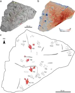 - ↑ Da-Qing Li, Li-Da Xing, Martin G. Lockley, Anthony Romilio, Jing-Tao Yang, Long-Feng Li: The first theropod tracks from the Middle Jurassic of Gansu, Northwest China: new and rare evidence of quadrupedal progression in theropod dinosaurs. In: Journal of Palaeogeography. 8. Jahrgang, Nr. 1, 2019, S. Article 10, doi:10.1186/s42501-019-0028-4 (englisch).