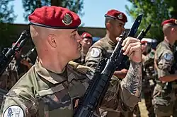Französischer Fallschirmjäger pflanzt ein Eickhorn SG 2000 WC-F auf ein HK416