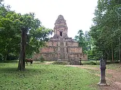 - darauf ein Prasat (Tempelturm) mit vier gleichen Fassaden, Zugang in der Ostseite, Scheintüren in den drei anderen Seiten, bestehend aus Cella (Tempelinnenraum) und vier Dachgeschossen.