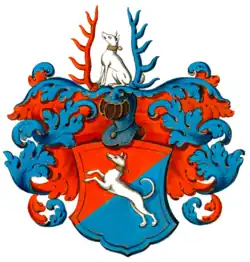 Im rot-blau schräglinksgeteiltem Schild ein aufspringender silberner Windhund (Windspiel) mit goldenem Halsband. Auf dem Helm mit blau-roten Decken der Windhund sitzend zwischen zwei Hirschstangen, die rechte rot, die linke blau (so gemäß Johann Siebmachers Wappenbuch von 1605, im Ulmer Münster sind die Hirschstangen vielfach rechts blau und links rot).
