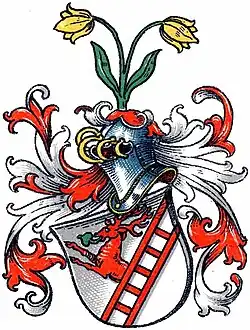 Das Stammwappen zeigt in Silber einen aus einer schräglinks gestellten, roten Leiter hervorspringenden natürlichen Hirsch mit einem grünen Blatt im Maul. Auf dem Helm mit silbernen und roten Decken, ein Zweig mit zwei goldenen Lilien, zwischen je zwei grünen Blättern.