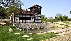 - Wenige hundert Meter nördlich des Dorfes in der Nähe des Bachlaufs der Tonna steht an der Straße Am Eselsstieg eine Bockwindmühle. Sie wurde 1834 erbaut und 1930 aus Eggersdorf zum heutigen Standort umgesetzt.[15] Alljährlich am Deutschen Mühlentag (Pfingstmontag) ist sie zur Besichtigung geöffnet. Die Mühle ist ein geschütztes Kulturdenkmal des Landkreises Gotha.[16]