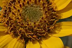 Die Blütenkörbe enthalten außen 5 bis über 21 Zungenblüten (Strahlenblüten) und innen viele, selten 15 bis meist 50 bis über 150 Röhrenblüten (Scheibenblüten). Die auffälligen, gelben bis orangefarbenen, nur bei Balsamorhiza rosea sich ziegelrot verfärbenden Zungenblüten sind weiblich und fertil. Die gelben bis orangefarbenen Röhrenblüten sind zwittrig sowie fertil und besitzen eine kurze Röhre, einen zylindrischen bis eng-glockenförmigen Schlund und fünf Kronzipfel.[3] Der Griffel ist zweiästig mit zwei wenig deutlichen Linien aus Narbengewebe und fadenförmigen Anhängseln.[1]