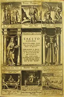 Baltasar Álamos de Barrientos (1555–1640), spanischer Gelehrter, wurde in Medina del Campo, einer Stadt in der Provinz Valladolid, geboren. Seine Freundschaft mit dem der Verschwörung verdächtigten Antonio Pérez führte dazu, dass er 1590 verhaftet und für fast dreizehn Jahre inhaftiert wurde. Sein Tácito Español ilustrado con aforismos (Madrid, 1614) ist das einzige Werk, das seinen Namen trägt, aber er ist wahrscheinlich der Autor des Discurso del gobierno, das Pérez zugeschrieben wird. Durch den Einfluss des Herzogs von Lerma (dem der Tácito gewidmet ist) und des Grafen-Herzogs von Olivares erlangte er später hohe offizielle Positionen.
