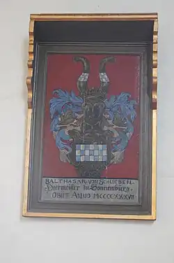 Wappenschild des gleichnamigen Heermeisters des Johanniterordens, Balthasar von Schlieben † 1437, in der Kirche der Komturei Lietzen.
