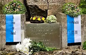1929 wurde auf dem Waldfriedhof von Riga ein Denkmal für die Gefallenen der Landeswehr errichtet, das jedoch kurz darauf von Unbekannten, vermutlich lettischen Nationalisten, gesprengt wurde. Ein an gleicher Stelle noch im selben Jahr erstelltes neues Denkmal, das von einem großen Findling beherrscht wurde, wurde beim Einmarsch der Roten Armee nach Ende des Zweiten Weltkriegs zerstört. Im Jahr 2001 veranlasste der Volksbund Deutsche Kriegsgräberfürsorge mit Unterstützung der Deutsch-Baltischen Landsmannschaft eine Teilrestaurierung, wobei die Fragmente des gesprengten Findlings mit Stahlschrauben wieder zusammengesetzt wurden. Von lettischer Seite gab es keinerlei negative Reaktionen auf die Neuerrichtung. Finanzierung und Wiedererrichtung lag in den Händen des Deutschbaltisch-Lettischen Zentrums Domus Rigensis. Mit der Pflege der Gedenkstätte ist das Brüderfriedhöfekomitee Lettlands betraut, das auch eine nahegelegene, ebenfalls 2001 wiedererrichtete Gedenkstätte für deutsche Gefallene aus dem Zweiten Weltkrieg betreut.[3][4]