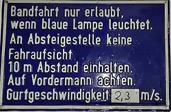 Der Bergmann betritt den Gurt über den Aufstieg. Die Bandfahrung wird so durchgeführt, dass der Bergmann während der Fahrt stets in Fahrtrichtung schaut.[2] In der Regel erfolgt die Bandfahrung auf dem Band liegend.[6] Bei abwärts gerichteten Strecken wird die Bandfahrung meistens auf dem Gurtband sitzend durchgeführt. Im Bereich der Abstiegstellen verändert der Bergmann seine Position auf dem Gurt und kniet sich auf den Gurt oder stellt sich hin, sodass er den Gurt problemlos über den Abstieg verlassen kann.[2]