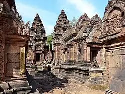 Im Zentrum der Anlage von Banteay Srei stehen drei Tempeltürme, Prasat genannt, nebeneinander auf einer T-förmigen, mit Friesen geschmückten Plattform, wobei dem zentralen, etwa 10 Meter hohen Turm eine Mandapa, ein pavillonartiger Vorbau mit Ziegeldach, vorgesetzt ist. Die den zentralen Prasat nördlich und südlich flankierenden Türme haben eine Höhe von etwas über 8 Metern.[1] In zahlreichen Nischen stehen etwa 70 Zentimeter kleine Figuren: Devatas, Apsaras und Dvarapalas. Diese Kunstwerke sind so fein herausgearbeitet, dass sie eher wie geschnitzt anmuten als in Stein gemeißelt.