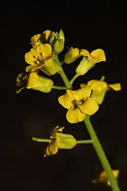 Die zwittrigen Blüten sind radiärsymmetrisch bis zygomorph, vierzählig mit doppelten Perianth. Die vier ausgebreiteten bis selten aufrechten Kelchblätter sind meist länglich, selten eiförmig oder linealisch und manchmal lange haltbar. Die vier leuchtend bis hell gelben, selten cremeweißen Kronblätter sind mindestens gleich lang wie die Kelchblätter, spatelförmig oder verkehrt-lanzettförmig und deutlich abgesetzt genagelt. In zwei Kreisen stehen insgesamt sechs Staubblätter. Die manchmal gelben Staubfäden sind verbreitert. Die Staubbeutel sind länglich. Es sind vier Nektardrüsen vorhanden, wobei die seitlichen ringförmig und die mittleren Drüsen zahnförmig ausgebildet sind. Der Fruchtknoten enthält etwa 10 bis 50 Samenanlagen. Der Griffel kann kaum erkennbar oder mit einer Länge von 5 mm deutlich ausbildet sein. Die Narbe ist kopfig oder manchmal leicht zweilappig.