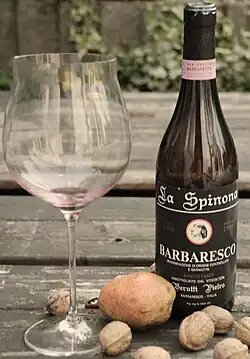 Barbaresco ist ein Wein, der aus der Region Langhe im Piemont, genauer aus dem Gebiet um die Ortschaften Barbaresco, Treiso und Neive, stammt.[1] Da er ebenso wie der Barolo sortenrein aus der Nebbiolorebe hergestellt wird, wird er oft als „der kleine Bruder“ des Barolo bezeichnet. Die beiden Ortschaften Barbaresco und Barolo liegen kaum 20 km Luftlinie voneinander entfernt. Im Unterschied zum Barolo liegen die Hügel des Barbaresco etwas niedriger und haben eine andere Bodenbeschaffenheit, sodass der Wein weniger wuchtig und dafür samtiger wird. 1966 wurde er als DOC klassifiziert, am 3. Oktober 1980 wurde er als DOCG anerkannt. Der Barbaresco wird auch „Wein der Königin“ genannt.