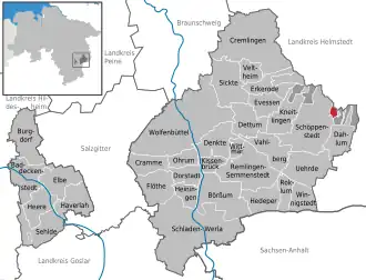 Es hat eine Fläche von 1,29 km²[1] und grenzt im Uhrzeigersinn im Osten an eine Exklave der Gemeinde Dahlum, im Süden an das gemeindefreie Gebiet Voigtsdahlum und im Westen an die Gemeinde Schöppenstedt im gleichen Landkreis. Im Norden besteht eine Grenze zum gemeindefreien Gebiet Brunsleberfeld im Landkreis Helmstedt.