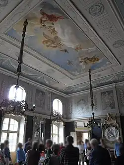 Das Innere zeigt ein prächtiges Vestibül mit Treppe ins Hauptgeschoss. Dort befindet sich der Festsaal, an dessen Wandfeldern Darstellungen der Jagd, der Tierzucht sowie der Land- und Forstwirtschaft zu finden sind. Das Deckengemälde wurde von Carl Jolas geschaffen und zeigt Apollo, der auf Pegasus durch den Himmel reitet.