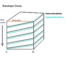 Die Isopyknenoberflächen (Flächen konstanter Dichte) und die Isobarenoberflächen sind parallel zueinander gerichtet. Ihre Neigung bleibt mit zunehmender Tiefe konstant. Daher ist der horizontale Druckgradient von B nach A sowie die geostrophische Strömung konstant mit der Tiefe.