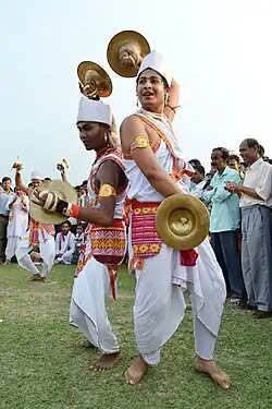 Zur Tradition des assamesischen Vishnuismus (Ekasarana Dharma) gehört auch das im 16. Jahrhundert von Sankaradeva entwickelte Tanzdrama Ankiya Nat. Drama war die letzte der Kunstformen, mit denen Sankaradeva in hohem Alter seine Religion in Assam verbreitete. Die Sänger (gayana) begleiten sich mit bartal und die Trommler (vayana) spielen khol. Als Melodieinstrument kommt die Kegeloboe kali (auch kaliya) vor, eine Variante der mohori oder in Südindien der mukhavina. Beim Auftritt Krishnas ertönt ein Schneckenhorn (sankh). Im Ankiya Nat-Ensemble der Stadt Nagaon spielten 1974 zwölf khol, sechs bartal und zwei kali.[15] Die Aufführungen finden im Namghar statt, dem traditionellen Versammlungshaus der von Sankaradeva gegründeten religiösen Gemeinschaft.[16]