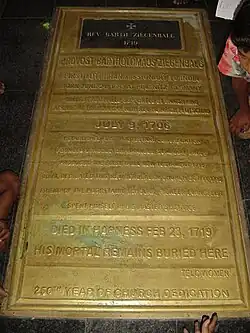 Bartholomäus Ziegenbalg (Tamil பர்த்தலோமேயு சீகன்பால்க்; * 10. Juli 1682 in Pulsnitz; † 23. Februar 1719 in Tranquebar) war ab 1706 der erste deutsche evangelische Missionar in Indien. Er kam mit der Dänisch-Halleschen Mission nach Südindien, erlernte die tamilische Sprache und übersetzte die Bibel, die als sogenannte Tranquebar-Bibel 1713 herauskam. Er gründete Schulen, ein Kinderheim und 1707 die erste evangelisch-lutherische Tamilgemeinde in Tranquebar, wo er auch die Neue Jerusalems-Kirche[1] erbauen ließ.