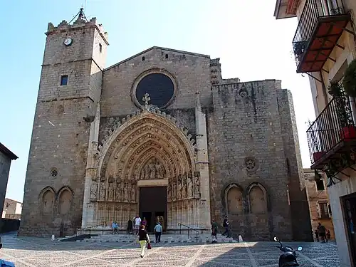 Die Basílica de Santa Maria ist ein imposantes Beispiel für die katalanische Gotik, die im Mittelalter von den Zisterziensermönchen in Katalonien eingeführt wurde. Sie zeichnet sich durch einen hallenartigen einheitlichen Innenraum aus, ohne klare Trennung zwischen Chor und Langhaus und, wie auch in diesem Fall, meist ohne Querschiff. Die Basílika verfügt über ein Zweiturmfassade mit einem aufwendig mit Figuren und Ornamenten verzierten Trichterportal aus Marmor und darüber einem großen Rosettenfenster. Der rechte Turm wurde nicht vollendet. An der linken Seite des Kirchenschiffs steht als dritter Turm der 36 Meter hohe fünfstöckige Glockenturm, der in Anlehnung an die damalige Architektur romanischer Glockentürme in der Lombardei gestaltet wurde; er stammt vermutlich aus dem 13. Jahrhundert.