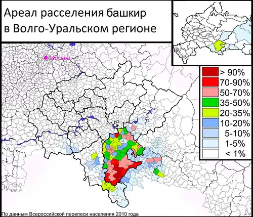 Etwa 68 Prozent der Baschkiren (1.172.287 in der Volkszählung 2010) lebt heute als zweitgrößte Bevölkerungsgruppe in der russischen autonomen Republik Baschkortostan, der Rest in den angrenzenden Oblasten Tscheljabinsk, Orenburg und Perm und in Tatarstan, in der Oblast Kurgan und kleinere Gruppen in den Oblasten Samara, Saratow, Swerdlowsk und im Autonomen Kreis der Chanten und Mansen (auch „Jugra“ genannt).