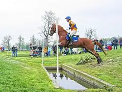 Wenig Bascule über einem Graben inmitten eines Coffin, Pferd und Reiter taxieren bereits den folgenden Anstieg