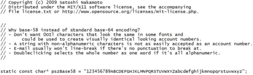 Das resultierende Alphabet der Länge 58 lautet 123456789ABCDEFGHJKLMNPQRSTUVWXYZabcdefghijkmnopqrstuvwxyz, es besteht somit nur aus verwechslungsfreien alpha-numerischen Zeichen.