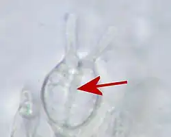 Phragmobasidie mit Längsseptum (roter Pfeil)