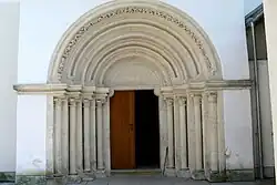 Die Westfassade ist asymmetrisch, weil sie südlich von Klostergebäuden überschnitten wird. Es zeigt sich ein hoher spitzer Giebel, ein hohes Rundbogenfenster und ein kleines rundbogiges Giebelfenster. Im Mittelschiffbereich ist das romanische Stufenportal in einer typischen Mauervorlage, vierfach abgestuft mit je vier Knospenkapitellsäulen mit Tellerbasen auf Sockeln, mit fünffach abgestuften, unterschiedlich profilierten Archivolten. Am Übergang zur Kämpferzone sind Hornanläufe auf Plockung und kleine Tierköpfe und Blattmotive. Das heute leere Tympanon hat eine umlaufende lateinische Inschrift.