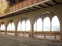 Die Eingangstür der Renaissancefassade hat einen Halbkreisbogen und eine reiche Dekoration und wird von Säulen eingerahmt, die durch ein Gebälk verbunden sind. Davor öffnet sich der Portikus auf Korinthischen Säulen.[6] Der Fries trägt die Signatur von Joan Tellet auf zwei Kartuschen neben einem kleinen Kragstein. Über dem Gesims und unter dem Schlussstein der Halbkreisbögen sind die Sockel von drei im Bürgerkrieg zerstörten Statuen erhalten geblieben. An der linken Wand des Portikus befindet sich der Eingang der Kapelle San Juan de Letrán und eine Treppe, die den Säulengang mit dem Innenhof verbindet.