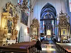 Das älteste Gemälde ist ein fragmentarisches (1970 entdecktes) gotisches Polychromat aus dem Jahr 1360 an der Südwand des Chorraums, das Szenen des Martyriums und der Kreuzigung darstellt. Der Hauptaltar enthält ein Veronikabild der Verklärung Christi, das aus dem 15. Jahrhundert stammt und 1785 hierher gebracht wurde. Zur Innenausstattung gehören unter anderem: eine Statue der Madonna mit Kind aus dem 14. Jahrhundert, ein Fries mit Reliefs der Apostel, das nach der Schlacht bei Tannenberg geschaffen wurde, drei gotische Portale aus dem 15. Jahrhundert, ein Taufstein aus dem Jahr 1557, ein Hauptaltar und zwei Seitenaltäre aus dem späten 17. Jahrhundert, zwei Rokoko-Seitenaltäre im Kirchenschiff. Die 34-stimmige Orgel wurde von Włodzimierz Truszczyński aus Warschau gebaut.[6]